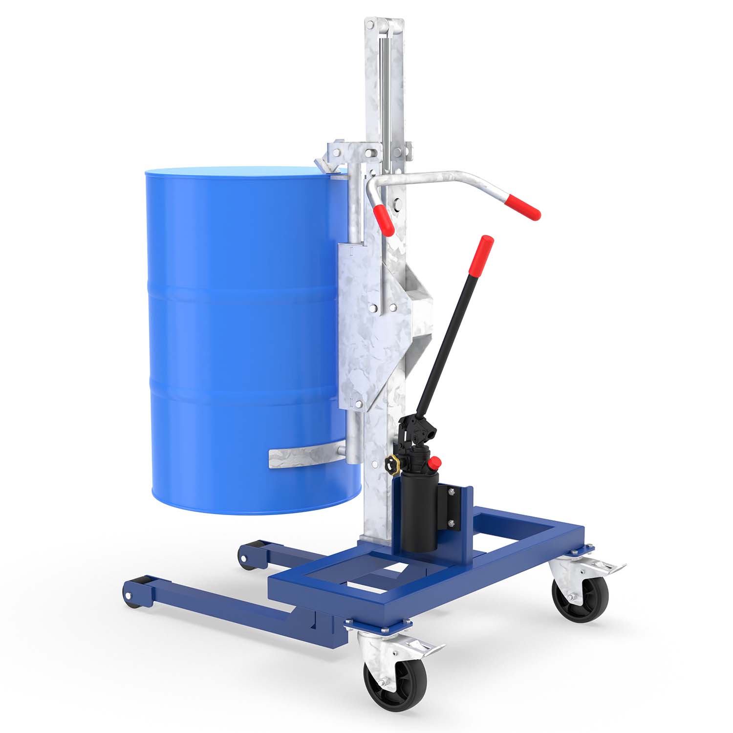 Der ATEX-Fassheber eignet sich für das einfache, aber sichere Verfahren und Heben von 200 l Fässern auf Paletten oder Auffangwannen. Auf dem Boden stehende Fässer werden durch die Spannautomatik des Fasshebers sicher gegriffen und gehalten. Das Lösen des Fasses geschieht nach dem Absenken mittels Handhebel. Das Heben erfolgt mit Hilfe des Pumphebels an der Hydraulik-Pumpe, das Senken fein regulierbar mittels Ablassventil. Alle Fassheber sind hinten mit Rollen ausgestattet, wobei die Lenkrollen mit Total-Feststellern ausgerüstet sind. Alle Rollen sind elektrisch leitfähig. Der Hydraulik-Hub des Fasshebers beträgt 550 mm und ist in Sondergrößen bis 1200 mm möglich.