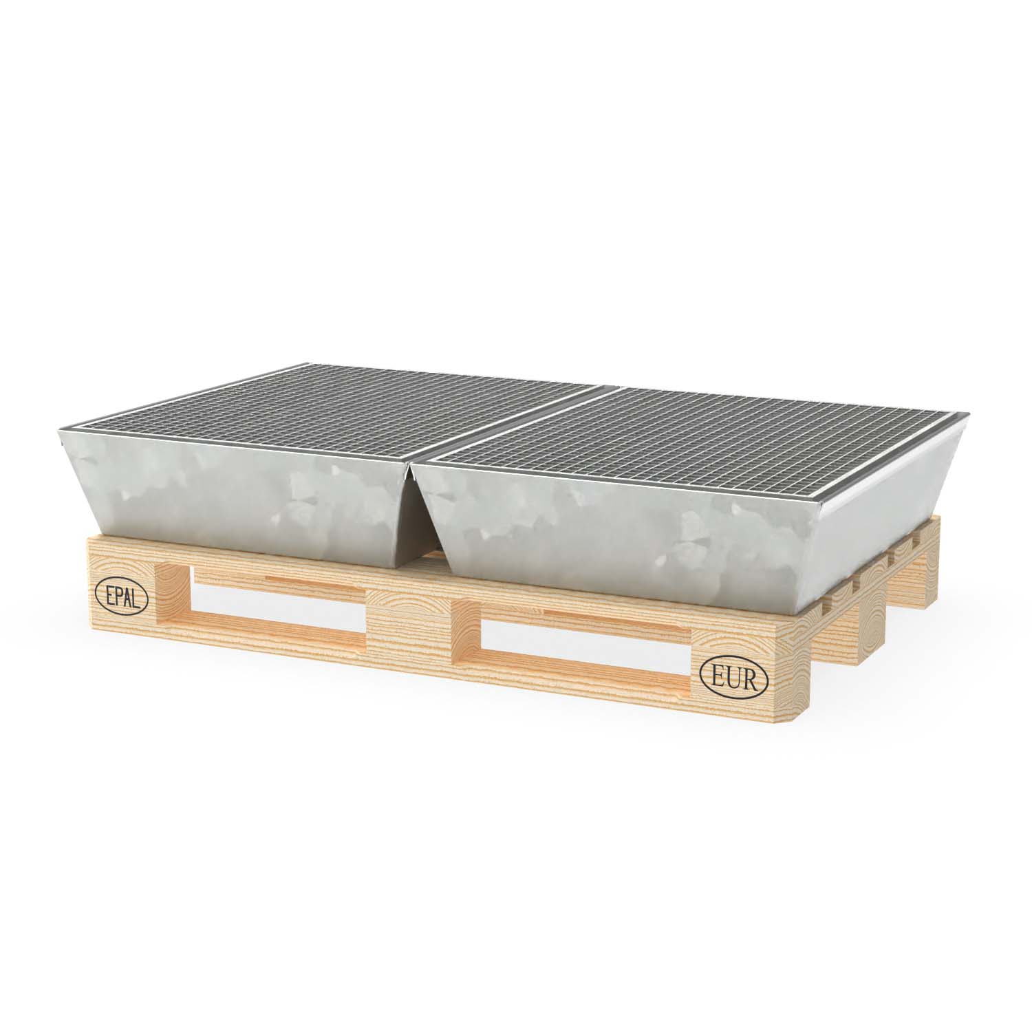 Paletten-Auffangwanne aus Stahl für 2 x 60 l Fässer, mit Gitterrost, verzinkt